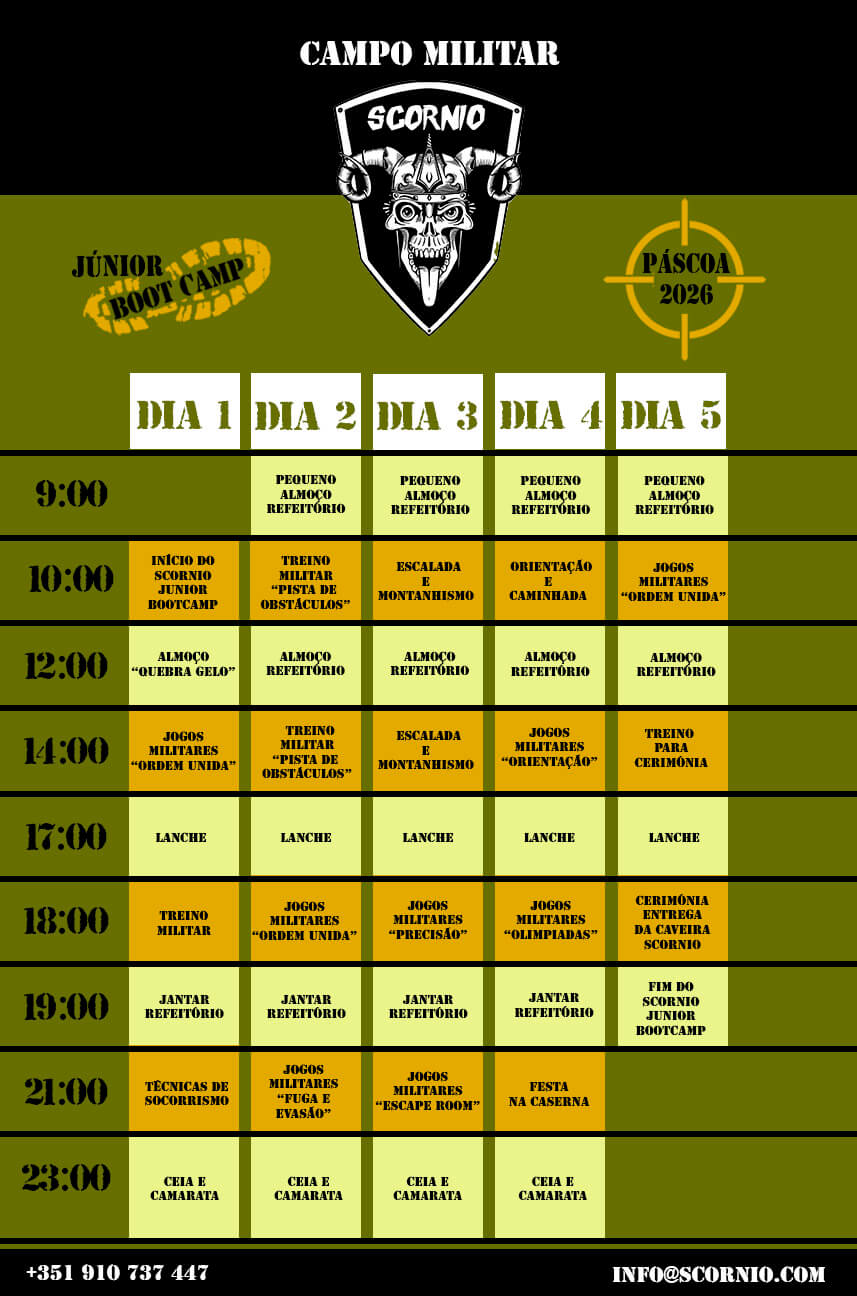 SCORNIO JUNIOR BOOTCAMP PÁSCOA 2026 – Campo de férias militar para jovens